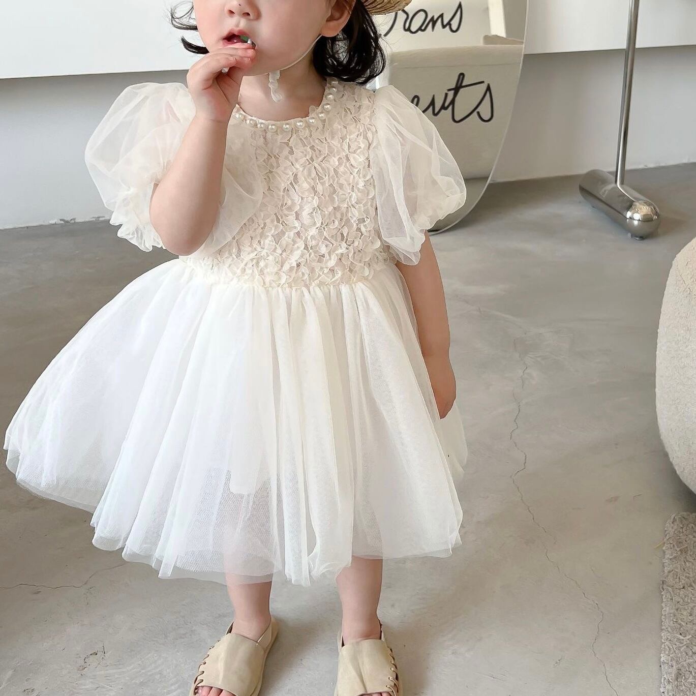首元のパールとスカートと袖部分のチュールが可愛いです.*。 ゚